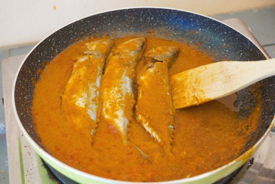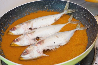 - ปรุงรสชาติด้วยเกลือ น้ำปลา และน้ำตาลทรายไม่ขัดสี แล้วใส่ปลาทูลงไป จากนั้นปิดฝาไว้ 2 นาที