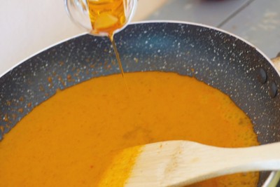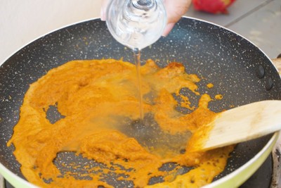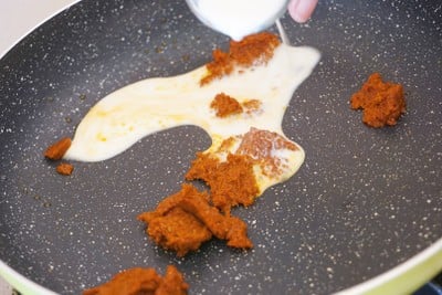 - ตั้งกระทะใส่น้ำมันลงไป พอน้ำมันร้อนใส่พริกแกงลงไปผัด จากนั้นเติมนม และน้ำเปล่าลงไปผัดต่อค่ะ
