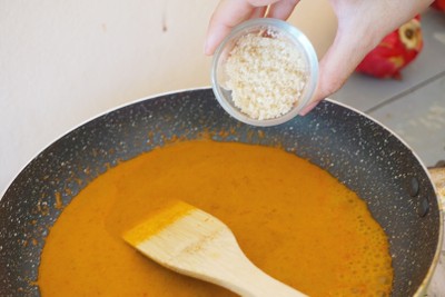 ใส่พริกแกงและนมพร่องมันเนยลงไปผัด